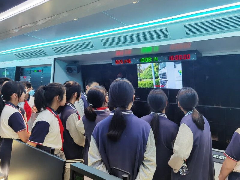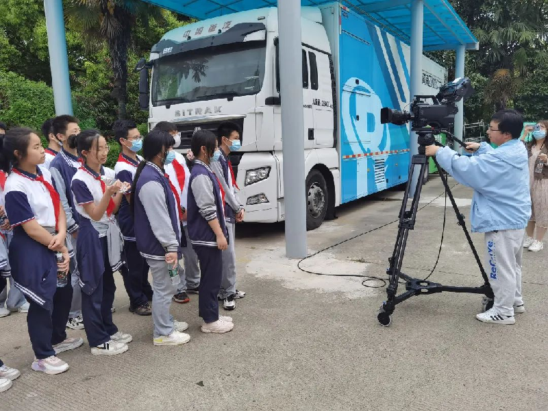第一站是探索转播车,同学们近距离的接触了转播车内部的各项设备,融媒体的老师也向同学们详细讲解了转播车上的每个岗位、各项设备的功能以及转播车是如何运作的。同时现场播放着车外的画面,同学们纷纷站在镜头前想让自己出现在画面中,其他同学看到这实时的互动画面也感到非常新奇。