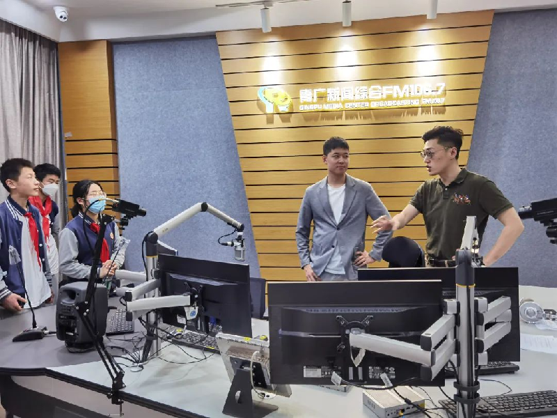 参观完转播车,由融媒体中心的主持人陈卓老师带领同学们进行更深入的探索。首先陈老师细心的给同学们讲解了“什么是广播电视台”、“主持人、记者和后期”、“新闻的生产”等理论知识,充实了同学们的知识库。接着陈老师带领同学们先后参观了新闻发布厅、喜马拉雅有声图书馆、主持人化妆间、新闻录制厅、后期剪辑机房、广播新闻录制厅等部门。同学们都像打开了新天地一样发出阵阵惊叹。