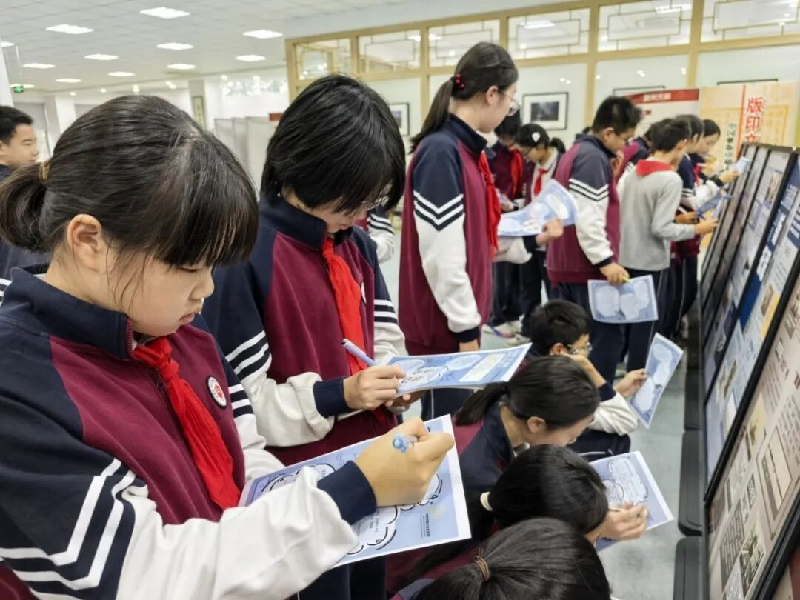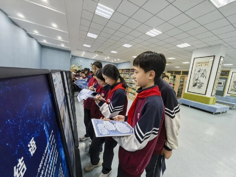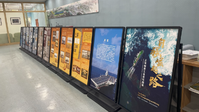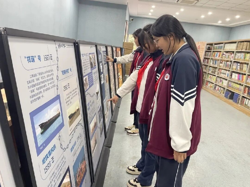 展览以“向海图强”为主线,图书馆内的展板系统呈现上海船舶工业百年变迁:从明清时期穿梭江海的沙船模型、1865年“黄鹄号”蒸汽船开启的造船新纪元,到1962年万吨水压机实现的自主突破,再到如今震惊世界的福建舰电磁弹射技术,每一段史料都串联起中国船舶工业从“跟跑”到“领跑”的科学发展脉络,让学生直观感受船舶制造的技术迭代与国家工业实力的跃升。