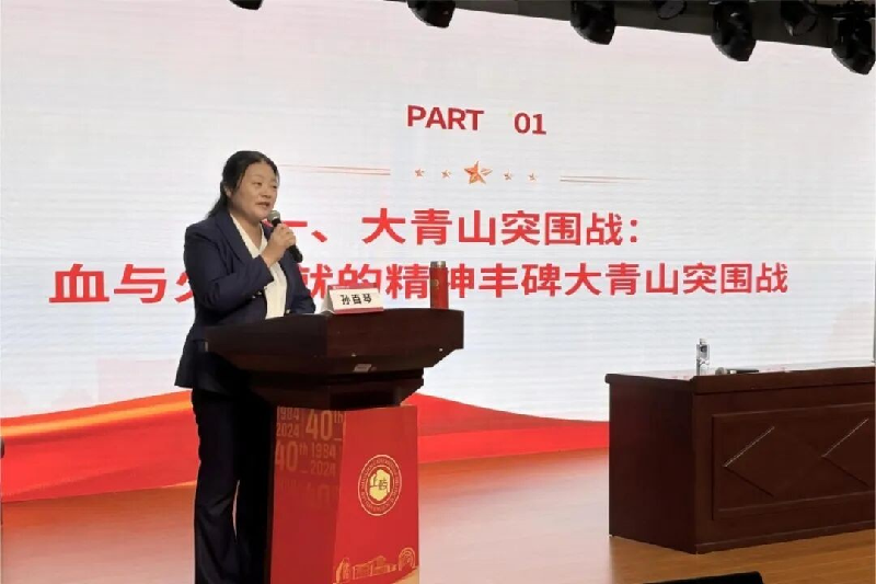 随后,孙百琴老师以《沂蒙精神薪火传:从大青山突围到新时代传承》为题展开宣讲。她从1941年大青山突围战中“独轮车推出来的胜利”讲起,再现了八路军战士与沂蒙群众并肩抗敌的壮烈场景;又通过周纯全将军扎根沂蒙、毕生奉献的感人事迹,以及《沂蒙山小调》从战地歌谣到时代赞歌的演变历程,展现沂蒙精神的历史厚度;最后结合新时代基层工作者——社区志愿者、乡村教师、抗疫一线人员践行“红嫂精神”的鲜活案例,让师生们明白沂蒙精神并非遥远的历史符号,而是贯穿时代的精神坐标。
