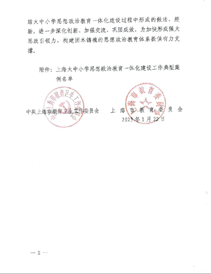 近日,中共上海市教育卫生工作委员会、上海市教育委员会公布2025年上海大中小学思想政治教育一体化建设工作典型案例名单,我校申报的《文化赋能“大思政”,校馆协同共育人》案例成功入选!这一成果是学校深化思政教育一体化建设的生动实践,更是文化资源与思政教育深度融合的重要突破。