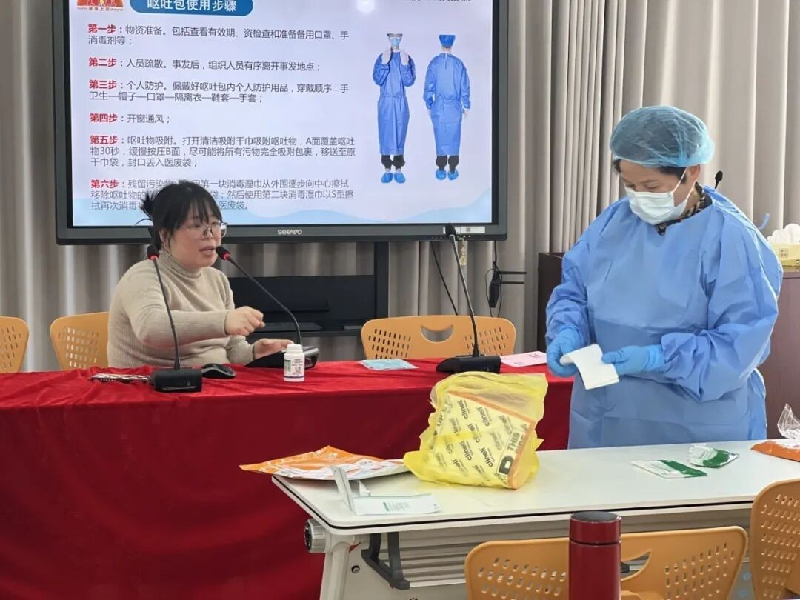 培训中,吴遵桃医生围绕校园常见传染病防控要点、常用消毒剂特性与使用规范、消毒操作流程、消毒剂科学配置方法等核心内容展开讲解,重点聚焦呕吐包使用实操技能。她详细拆解了呕吐包使用的全流程,从物资准备、人员疏散、个人防护,到呕吐物吸附、污染区域消毒、医疗废物处理等关键环节逐一说明。另外,她还特别强调了2000mg/L 有效氯(溴)消毒液的使用标准、消毒作用时长及个人防护用品的正确穿戴与脱卸顺序。同时,吴医生结合诺如病毒等传染病传播特点,针对性讲解了疫情分级处置、病例隔离观察等防控知识,并解答了老师们在日常管理中遇到的疑问。