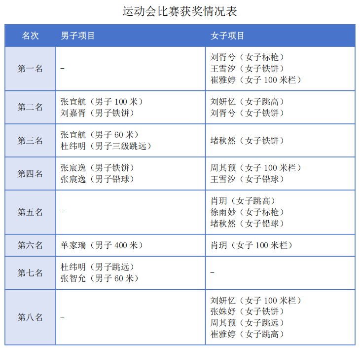 在区级田径比赛中,我校选手展现了全面发展的体育素养,获得了团体总分第二名及多项个人前八名的骄人成绩: