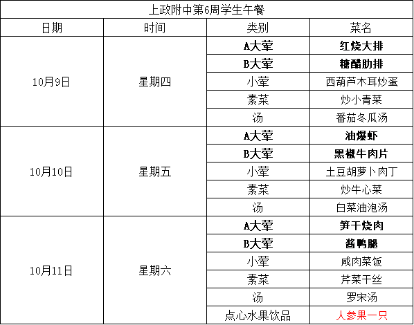 2025学年第一学期上政附中学生营养午餐菜谱 第6周(10月9日—10月11日)