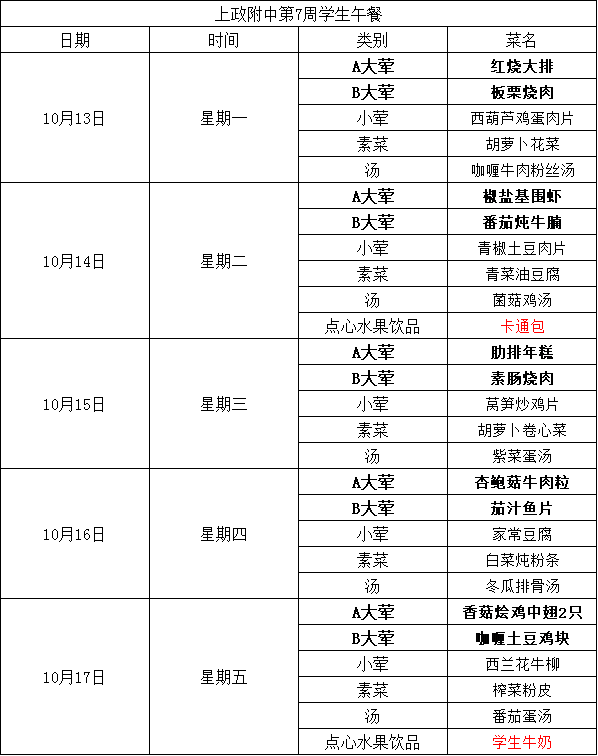 2025学年第一学期上政附中学生营养午餐菜谱 第7周(10月13日—10月17日)