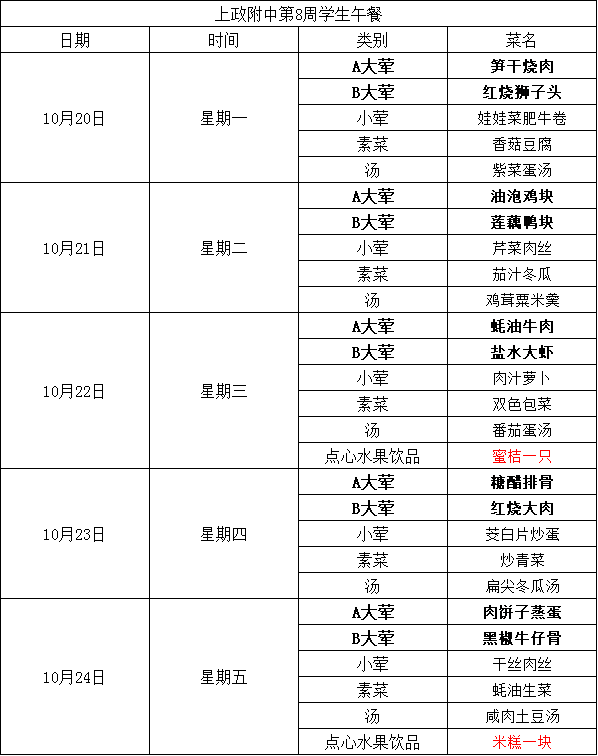 2025学年第一学期上政附中学生营养午餐菜谱 第8周(10月20日—10月24日)