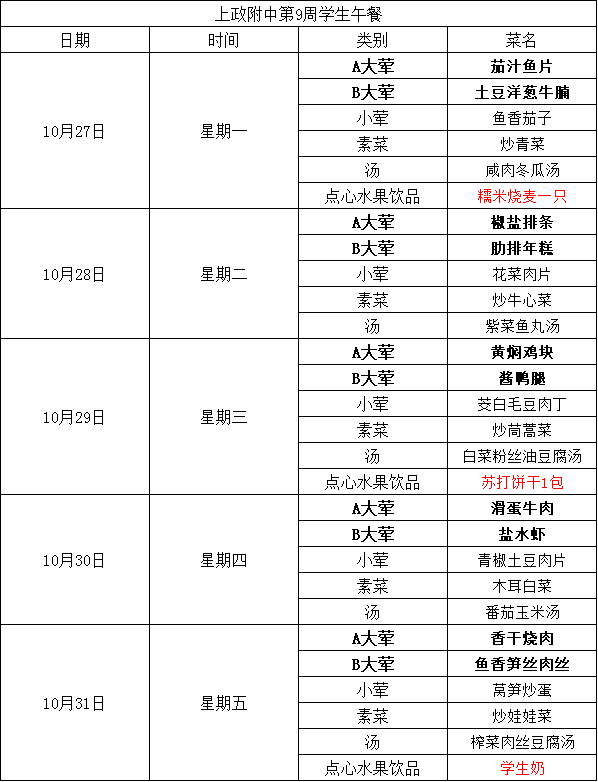 2025学年第一学期上政附中学生营养午餐菜谱 第9周(10月27日—10月31日)