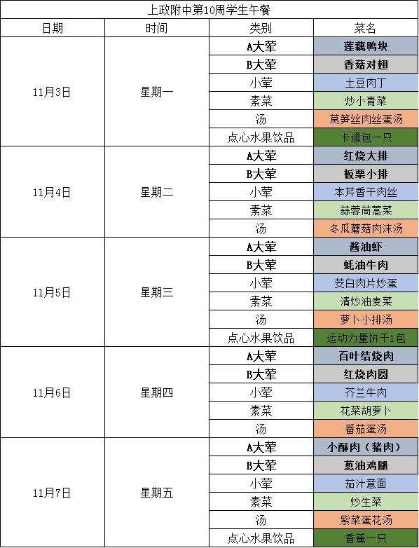 2025学年第一学期上政附中学生营养午餐菜谱 第10周(11月3日—11月7日)