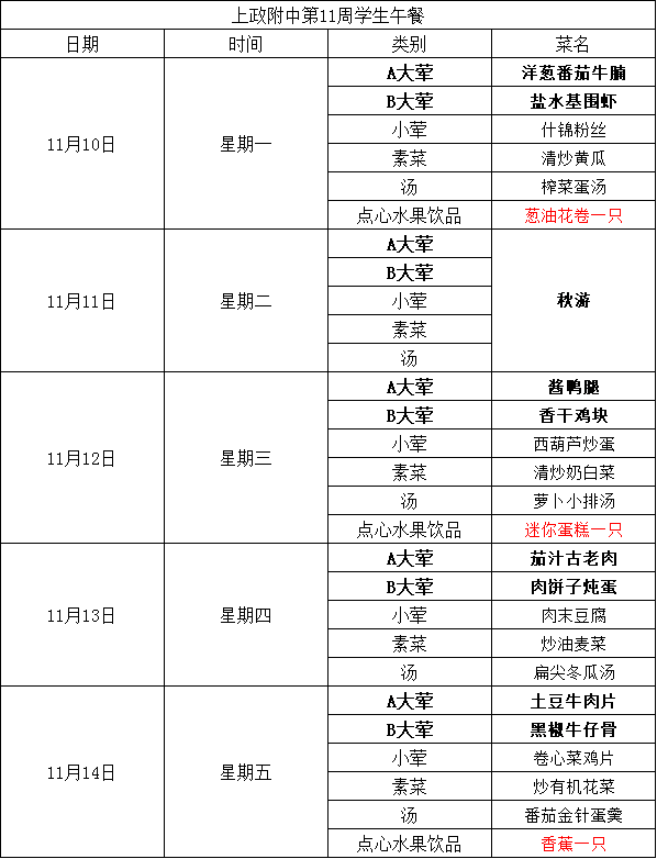 2025学年第一学期上政附中学生营养午餐菜谱 第11周(11月10日—11月14日)