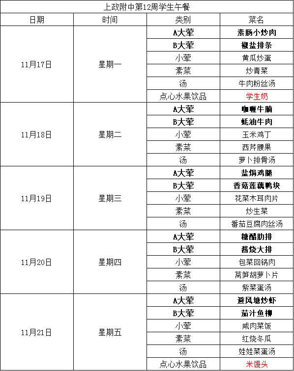 2025学年第一学期上政附中学生营养午餐菜谱 第12周(11月17日—11月21日)
