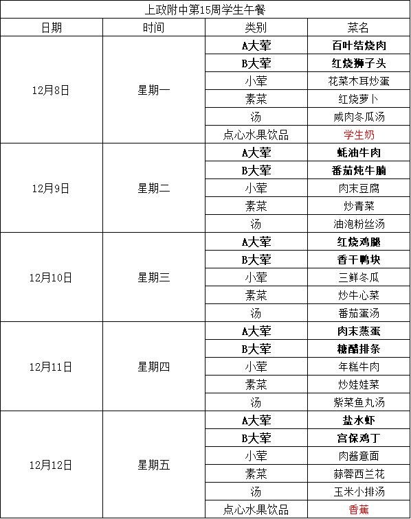 2025学年第一学期上政附中学生营养午餐菜谱 第15周(12月8日—12月12日)