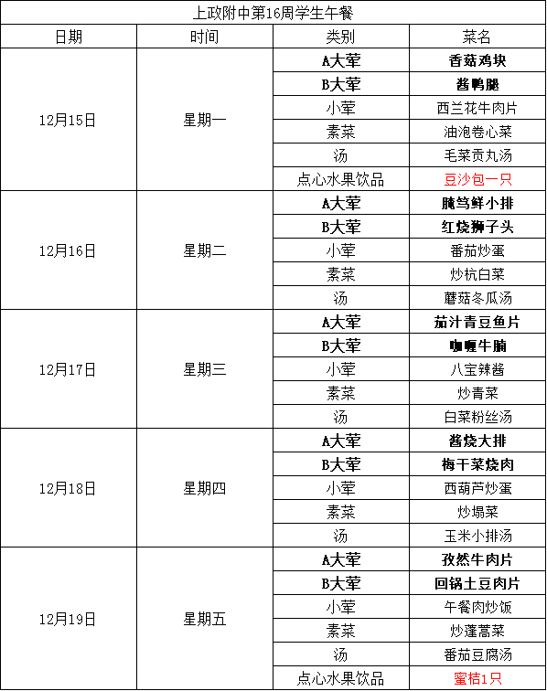2025学年第一学期上政附中学生营养午餐菜谱 第16周(12月15日—12月19日)