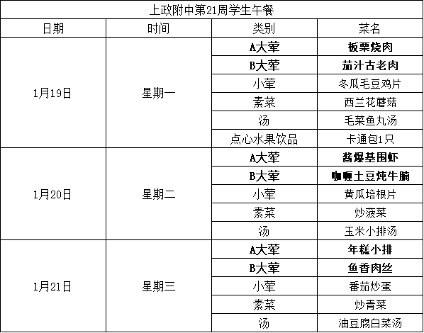 2025学年第一学期上政附中学生营养午餐菜谱 第21周(1月19日—1月21日)